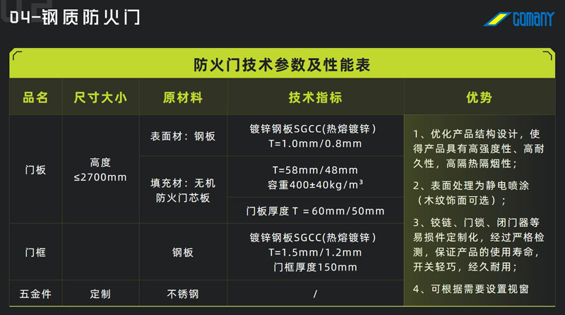 - 特性:采用冷軋熱熔鍍鋅鋼板加工制作,門扇內(nèi)部按照耐火等級(jí)要求填充環(huán)保不燃材料,并配以國(guó)家消防檢測(cè)合格的五金件,滿足耐火穩(wěn)定性完整性和隔熱性等各項(xiàng)技術(shù)要求。