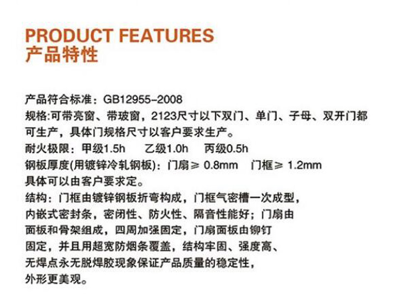 - 特性:加匯鋼質(zhì)防火門采用鋼質(zhì)材料制作門檻,門扇骨架和門扇面板,內(nèi)部填充防火隔熱材料,并配置防火五金,具有良好的防火隔熱性能,可滿足GB防火門標準。