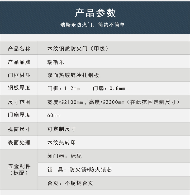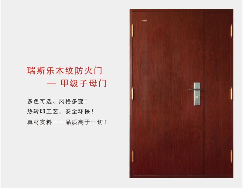 - 特性:瑞思樂木紋鋼質(zhì)門通過木紋轉(zhuǎn)印技術(shù),讓鋼質(zhì)防火門也能具有木紋的外觀,適用更多風(fēng)格的防火場(chǎng)所。