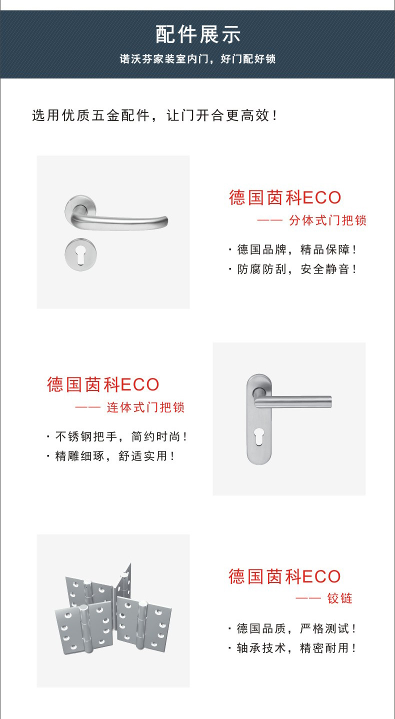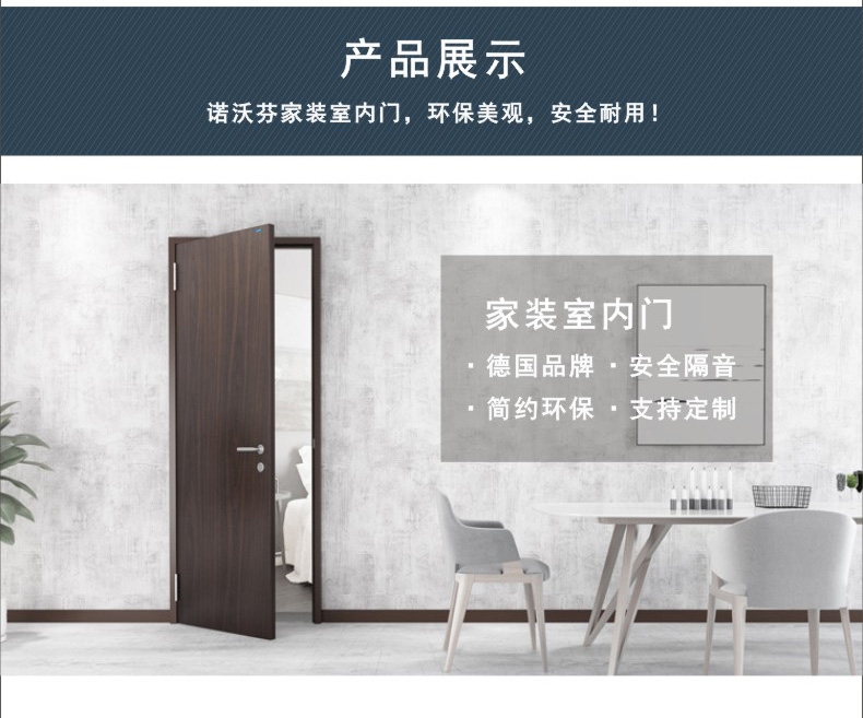 - 特性:諾沃芬室內(nèi)門具有環(huán)保美觀,安全可靠等特點(diǎn),門框鑲嵌式密封條結(jié)構(gòu)、隔音效果好、使用輕便舒適,采用高品質(zhì)五金件,美觀實(shí)用,讓門開合更輕松!